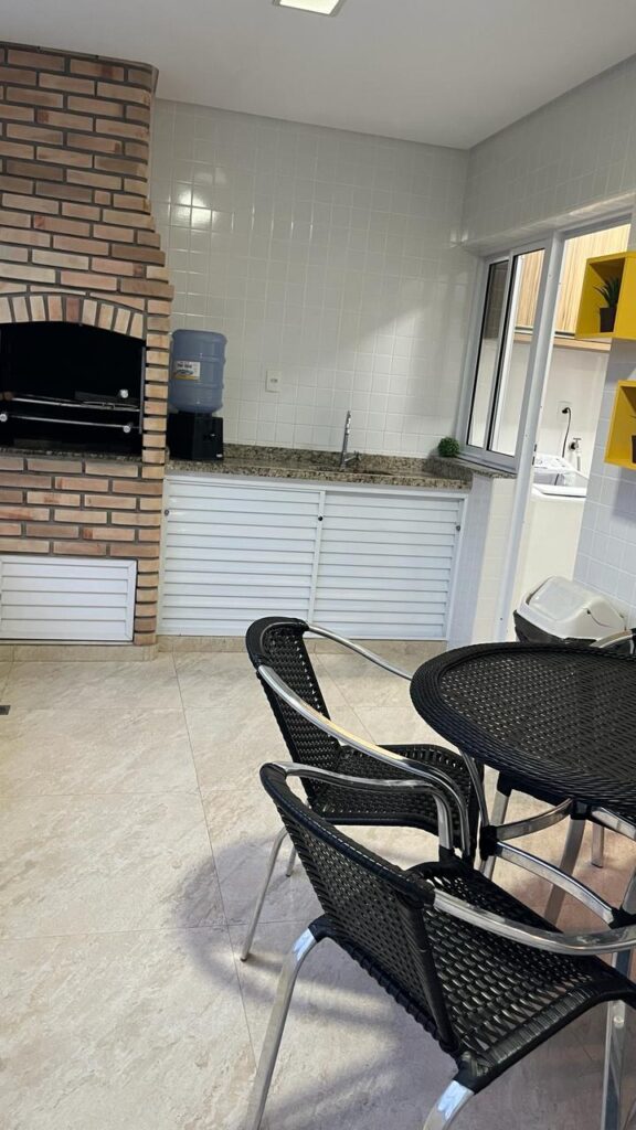 Varanda gourmet com churrasqueira, perfeita para confraternizações e refeições deliciosas com vista.